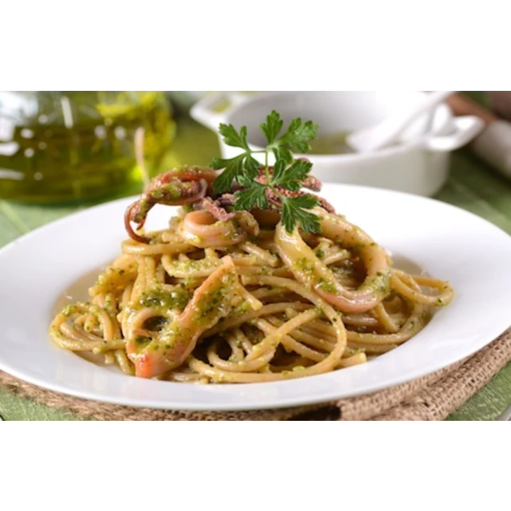 Spaghetti con calamari e crema di piselli